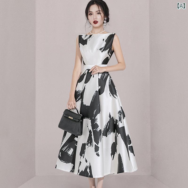 ・素材: ポリエステル80-90%・柄: プリント・スタイル: ベーシック・スカート丈: ミモレ丈・スカートタイプ: フレア・ネックライン: ラウンドネック・袖丈: ノースリーブ・ウエスト: ミディアムウエスト・カラー: ブラック/ホワイト・サイズ: S, M, L, XL・テイスト: エレガント, オフィス・フロント: ジッパー・種類: ワンピース