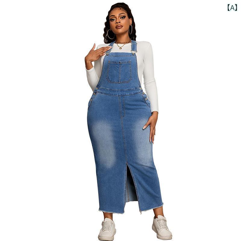 ・素材: 綿、デニム・加工: ウォッシュ加工・スタイル: サロペット・スカート丈: ロング・スカート型: サロペットスカート・ネックライン: サロペット・袖丈: ノースリーブ・デザイン: スリット・カラー: ミディアムブルー・サイズ: 1XL, 2XL, 3XL, 4XL, 5XL・テイスト: エレガント、通勤