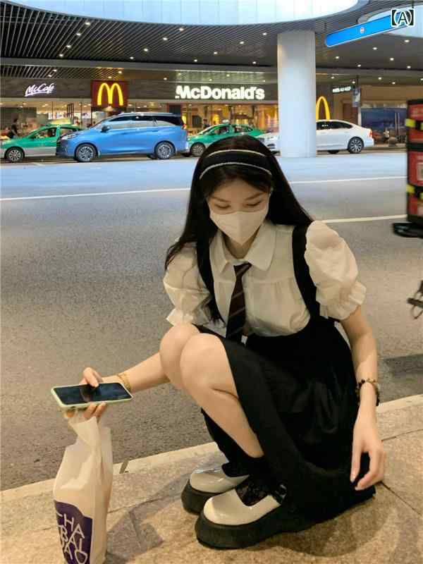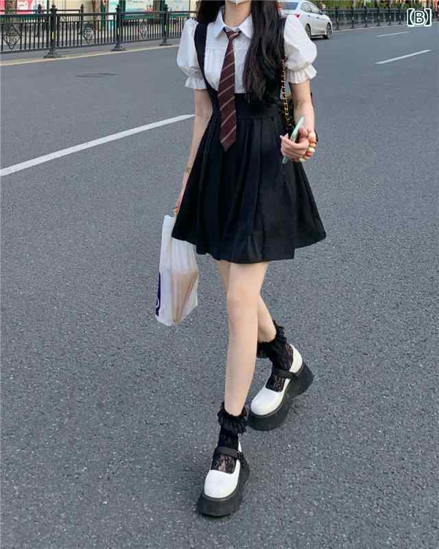 ・素材: PVC、その他・柄: 無地・デザイン: サスペンダー・スタイル: サスペンダー・セット内容: 2点セット・スカート丈: ミモレ丈・スカートタイプ: サスペンダースカート・ネックライン: ポロネック・袖: パフスリーブ・袖丈: 半袖・ウエスト: ハイウエスト・カラー: 白シャツ+ネクタイ、サスペンダースカート、白シャツ+ネクタイ+サスペンダースカート・サイズ: S、M、L、XL・スタイル: 文学的なレトロ、チャイナスタイル・フロント: シングルブレスト・主素材の含有量: 30%以下・スカートの種類: ワンピース