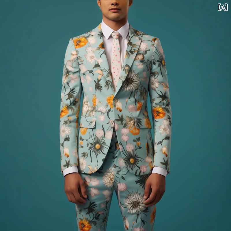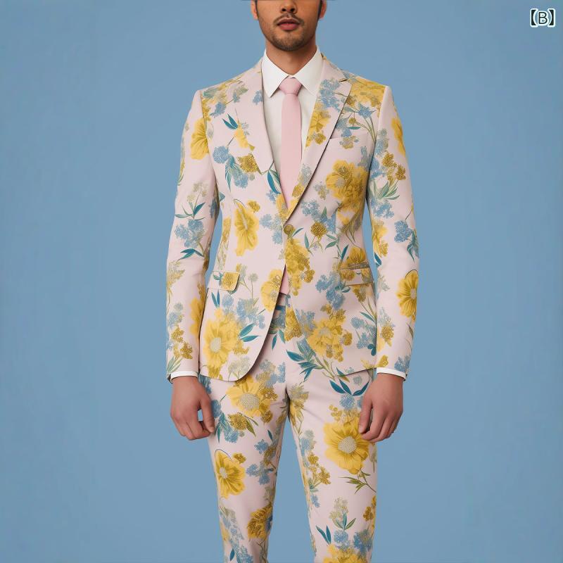 ・カテゴリ: スーツ・対象年齢: 24-35歳・フロント: シングル2つボタン・生地: 綿混紡・素材: ポリエステル繊維97%・シーン: カジュアル・ベント: 背面中央・フィット: スリム・厚さ: 普通・ディテール: ジャカード・カラー: 花柄-1, 花柄-2, 花柄-3, 花柄-4・サイズ: XS, S, M, L, XL, XXL, XXXL, XXXXL・スタイル: イギリス風・機能: 通気性