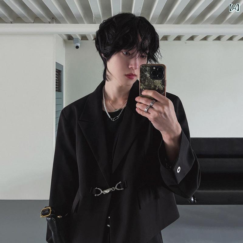 ・カテゴリ: ジャケット・対象年齢: 18-24歳・フロント: シングルブレスト・素材: ポリエステル80%、綿20%・シーン: カジュアル・襟: ノッチドラペル・スタイル: 韓国・フィット: レギュラー・厚さ: 普通・ディテール: メタル装飾・カラー: ブラック・サイズ: M、L、XL、2XL