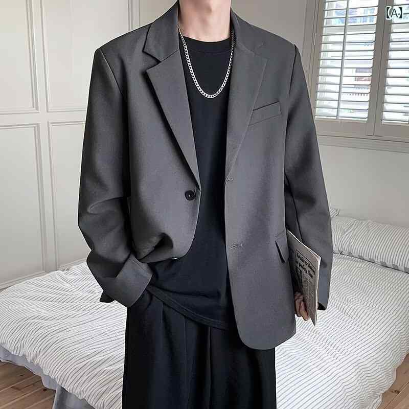 ・カテゴリ: カジュアルスーツ・スタイル: 韓国風・柄: 無地・素材: ポリエステル・生地: ポリエステル繊維・フィット: ルーズ・襟の形: スーツ襟・前立て: シングルブレスト、2つボタン・対象年齢: 成人・対象: 青年・袖丈: 長袖・色: ダークグレー, ブラック・サイズ: S, M, L, XL, 2XL, 3XL, 4XL, 5XL・誤差範囲: 1-3cm・ポケットスタイル: フラップ付きポケット・裾のデザイン: ストレート・その他: アイロン不要