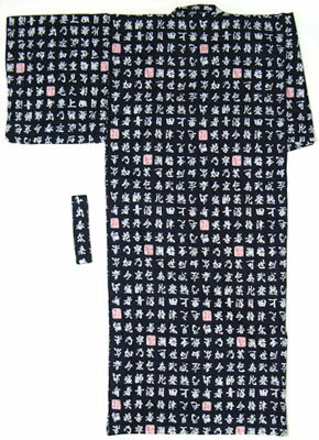 商品紹介 サイズ 【L】約身長165cm〜175cm幅 フリー 店長の一言 綿 100%人気の高い漢字の総柄です。 海外向け おみやげ浴衣 漢字 男性用 紺色 着物の襟と袖が、いかにも日本的です。海外の方には相変わらず人気の浴衣です。ジャスト丈で、気楽に着ていただく方が多いようです。身幅は、もちろん 自由に調整できます。共布で紐も付いています。日本文化の紹介として贈り物にも喜ばれています。