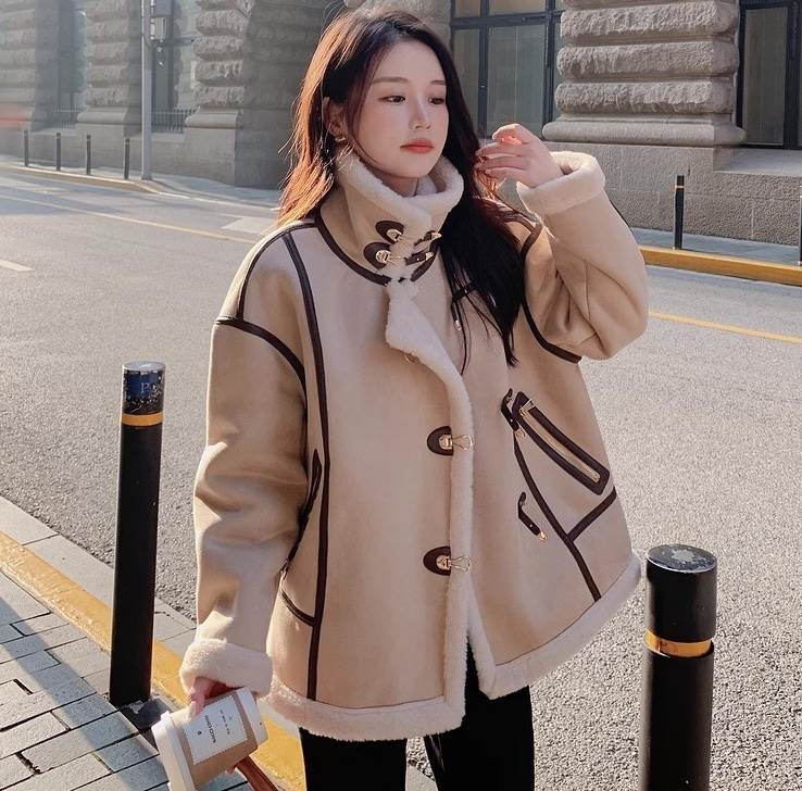 ボアジャケットでふわふわの温もりを感じながら、ハイネック襟がクールで大人可愛いスタイルを演出。