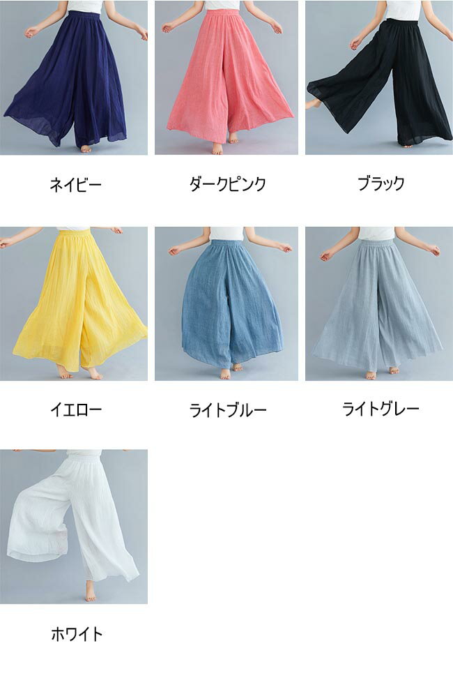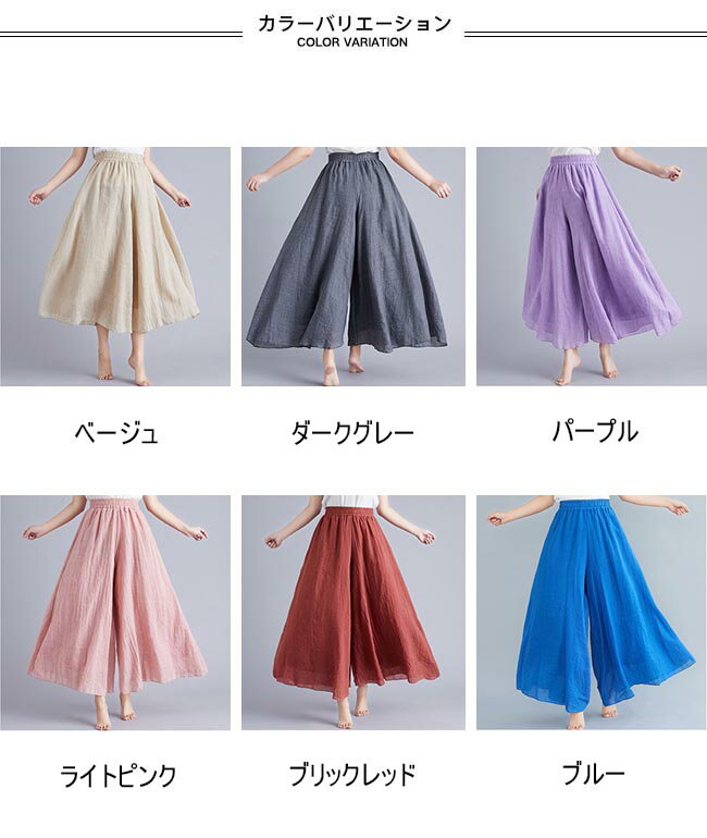 ■全13色 コットンリネンマキシ丈キュロットスカート 全13色から選べるキュロットスカート 肌に優しいコットンリネン素材を使用したので最適な履き心地を ふんわりとしたボリューム感で魅せるエアリーなシルエットもとてもフェミニンな印象 風通しも良くて、春夏ファッションに快適感と涼しいさをもたらす ウエストゴムなので幅広い体型に対応できる&ストレスフリー 動くたびに風に揺れて女性らしさを醸し出す 落ち着きの色から鮮やかな色まで、豊かなカラバリが用意されてお好み次第で選べる