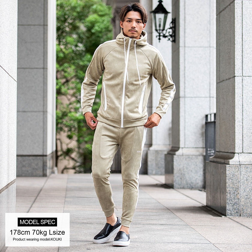 【45448 スエード切り替えパンツ】とセットアップコーデもおすすめ! 軽くて動きやすいのでジムなどのトレーニングはもちろん、ゴルフなどのスポーツにも最適な一枚です。