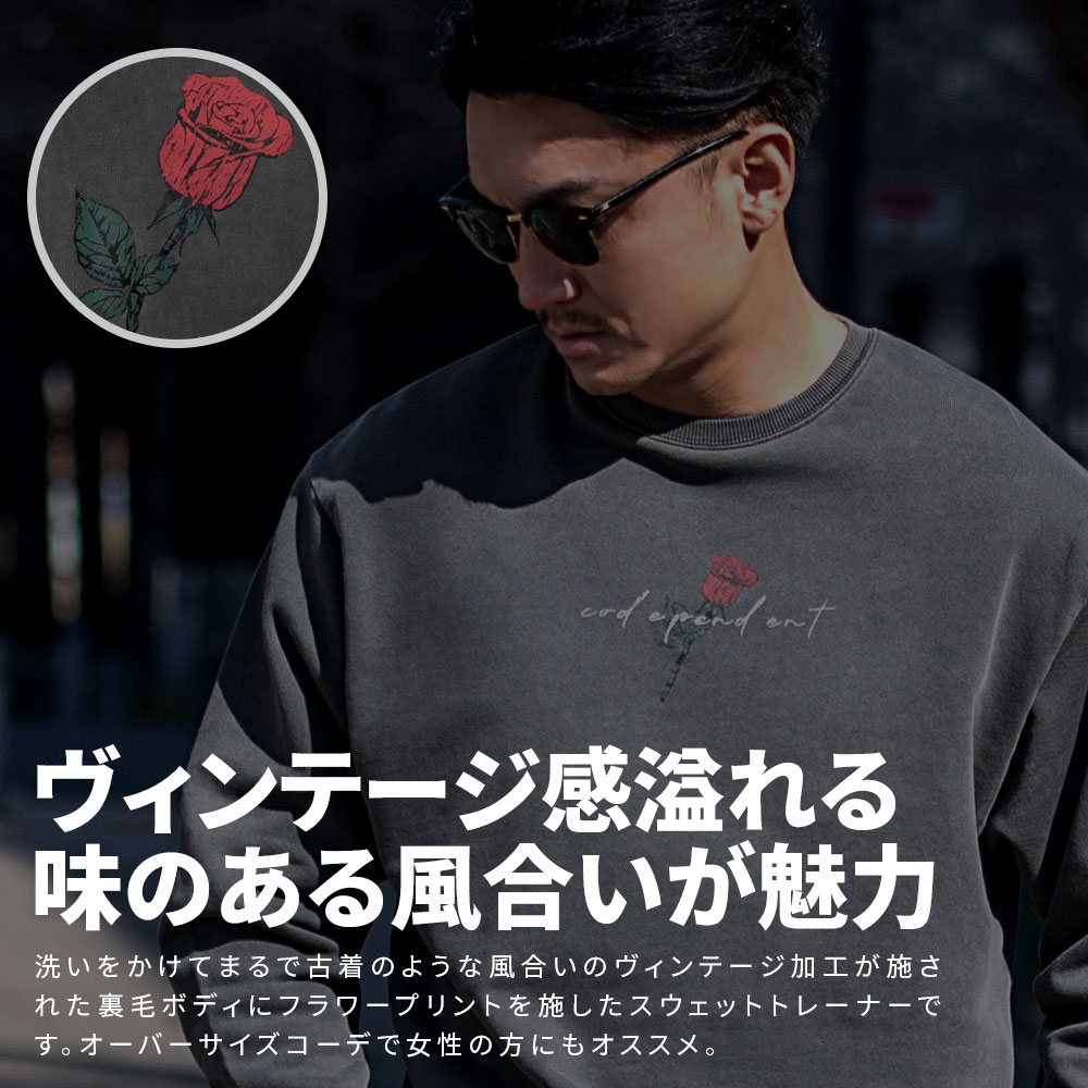 洗いをかけてまるで古着のような風合いのヴィンテージ加工が施された裏毛ボディにフラワープリントを施したスウェットトレーナーです。