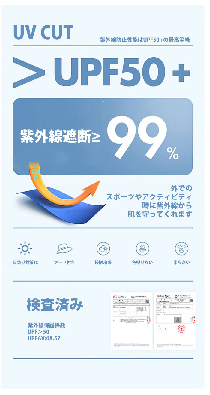 このパーカーはUPF50+の高いUVカット率を誇り、肌を紫外線から守ります。