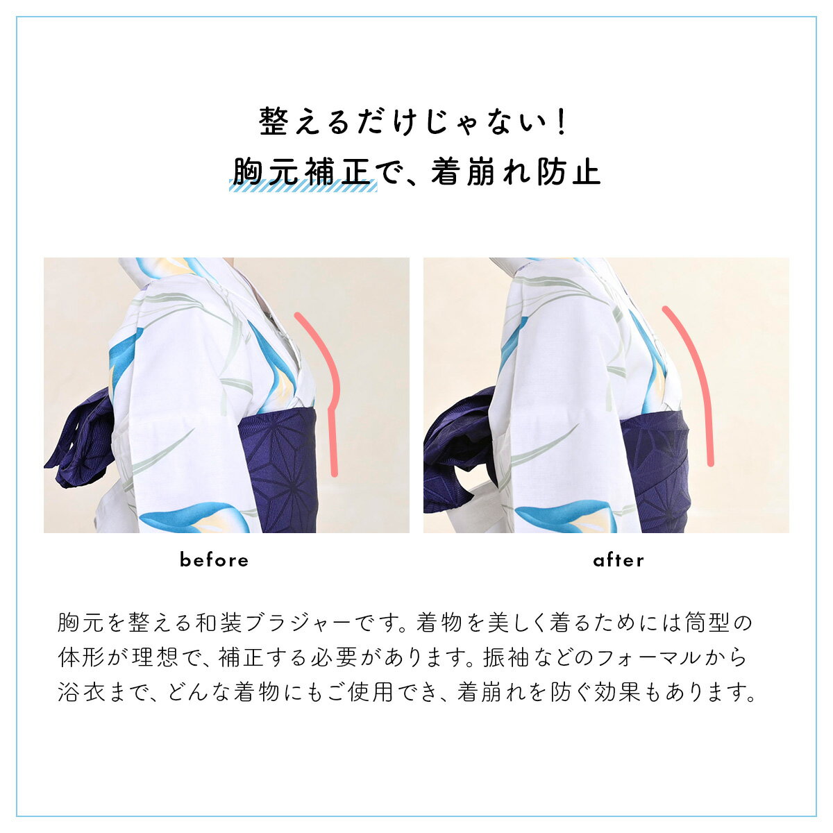 振袖や訪問着などのフォーマルから浴衣まで、どんな着物にもご使用いただけ、着崩れを防ぐ事もできます。