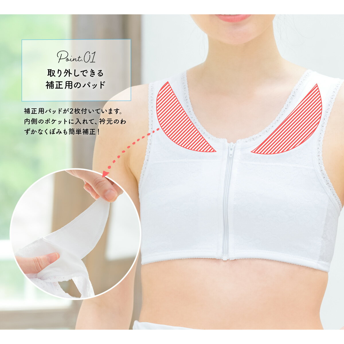衿元のわずかなくぼみも取り外しのできる補正用のパッドが付いていて大変便利です。