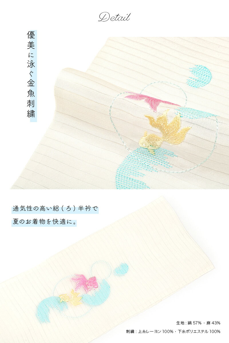涼しげな絽の生地に、水滴を思わせる水玉や、ひらひらと泳ぐ金魚が刺繍されています。