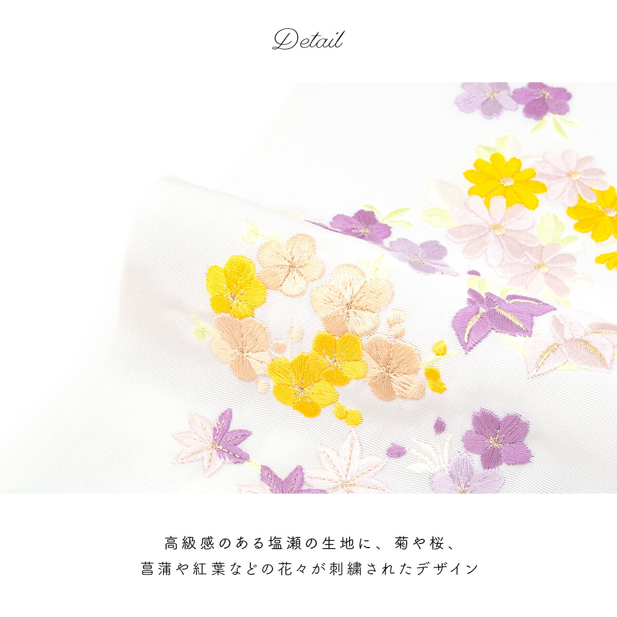 厚地の羽二重が高級感のある塩瀬の生地に、菊や桜、菖蒲や紅葉などの花丸紋が刺繍された華やかなデザインです。