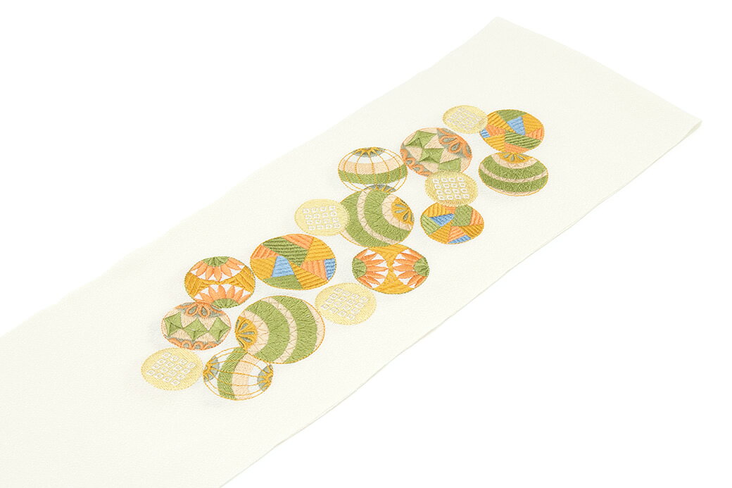 高級感のある縮緬の生地に、いろいろな手鞠が華やかに刺繍されています。