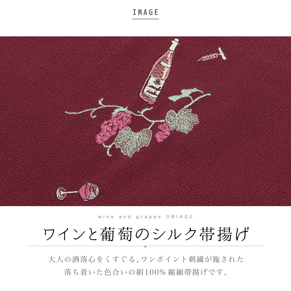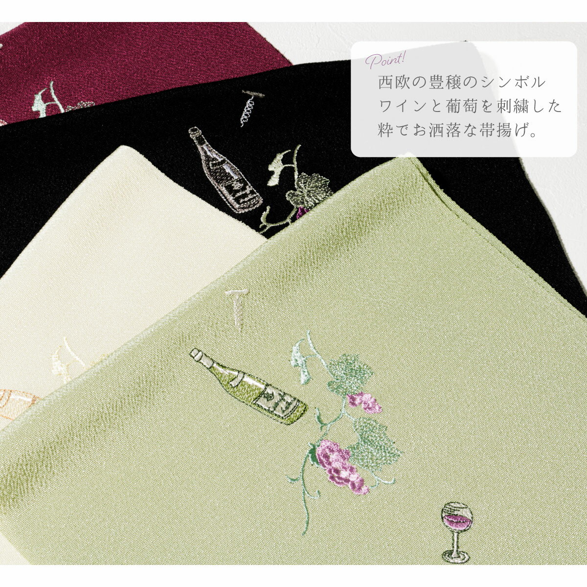 縮緬(ちりめん)地にワンポイントで葡萄やワインなどの刺繍が施されたデザインです。