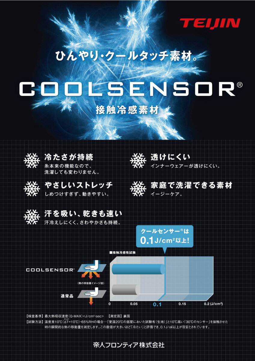 素材の「COOLSENSOR(R)クールセンサー」は帝人が開発した接触冷感素材で、接触冷感、防透、吸汗速乾の汗を吸い乾きも早く、触ると「ひんやり」ここち良い素材です。