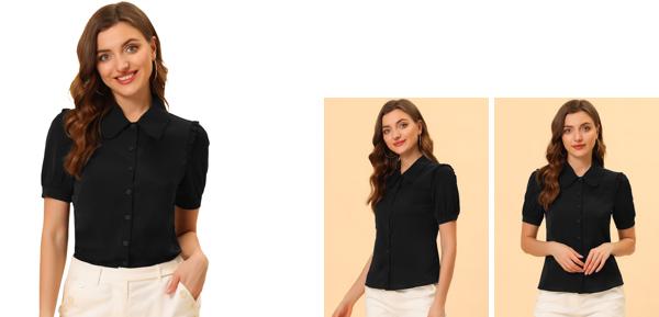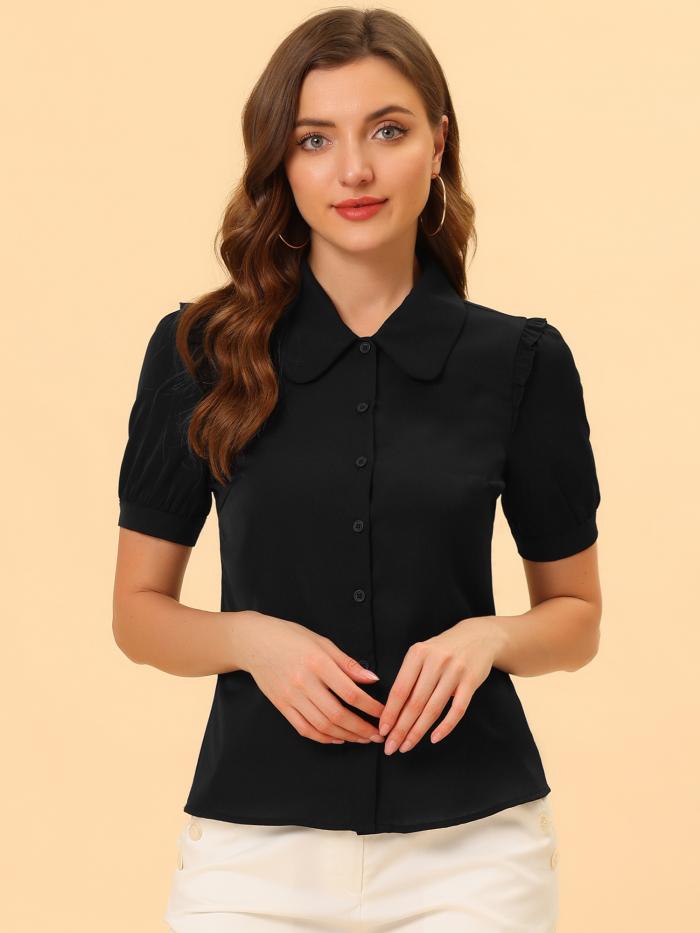 【商品説明】100%ポリエステル生地、ピーターパンカラー、バブルスリーブ、フリルトリムショルダー、半袖機会:オフィス、ショッピング、デート、週末の集まり、アウトドア、カジュアルなどリラックスしたフィット感。