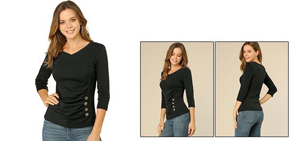 このトップはボタンデコレーション、Vネック、七分袖、シャーリングフロントが特徴です。