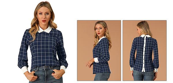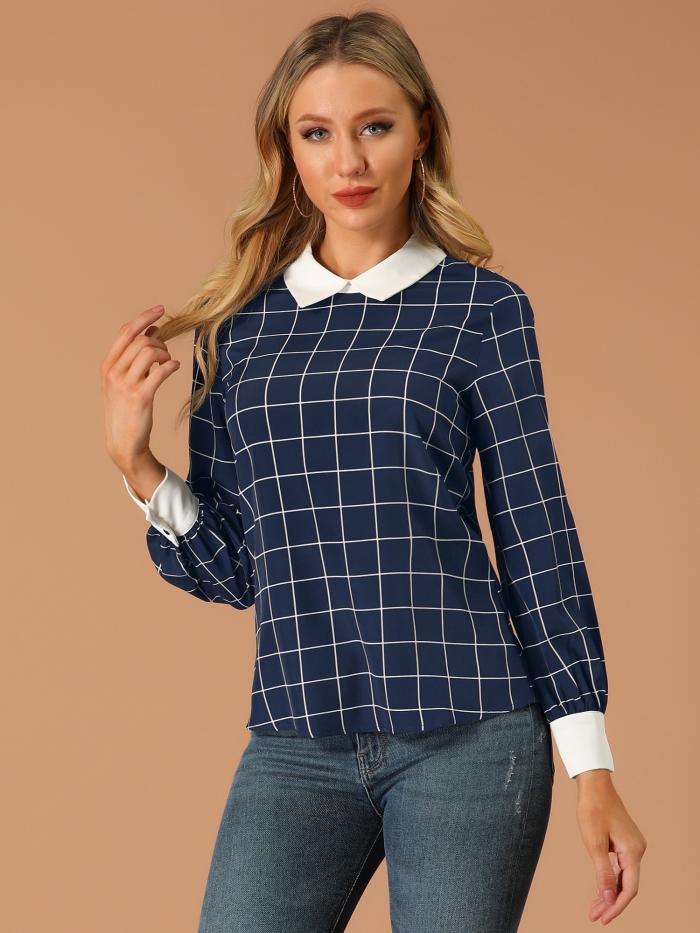 シンプルで繊細、 このシャツは、コントラストのあるターンダウンカラー、ボタンバック、チェックチェック柄、長袖が特徴です。
