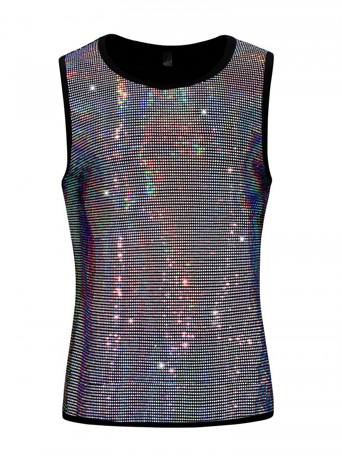 【スタイリッシュなデザイン】スパンコールパターン、クルーネック、シャイニーノースリーブ、光沢のあるパーティーメタリックタンクトップ。