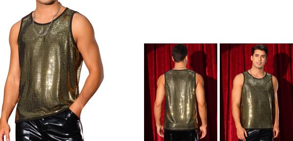 【スタイリッシュなデザイン】スパンコールパターン、クルーネック、シャイニーノースリーブ、光沢のあるパーティーメタリックタンクトップ。