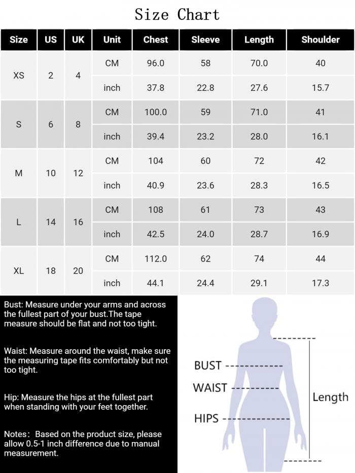寸法(インチ)サイズ-----------胸囲-----------袖丈-----------着丈-----------肩幅XS----------------37.8--------------22.8--------------27.6------------------15.7S------------------39.4--------------23.2--------------28.0-------------------16.1M----------------40.9--------------23.6--------------28.3------------------16.5L------------------42.5--------------24.0--------------28.7-------------------16.9XL----------------44.1--------------24.4--------------29.1------------------17.3 注意書き