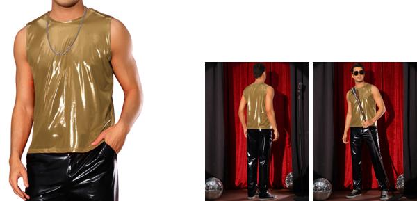 【パーティースタイル】このディスコ光沢のあるベストは、フェイクレザーパンツやフェイクレザーショーツと組み合わせてパーティールックを演出できます。