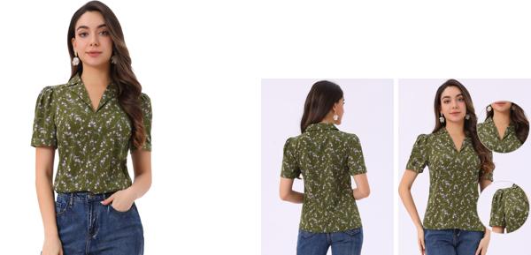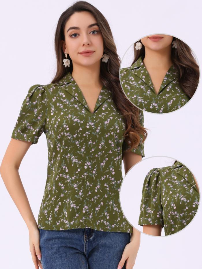このプリントサマーシャツは、Vネック、パフ半袖、折り返しカフスでデザインされており、毎日の着用に最適です。