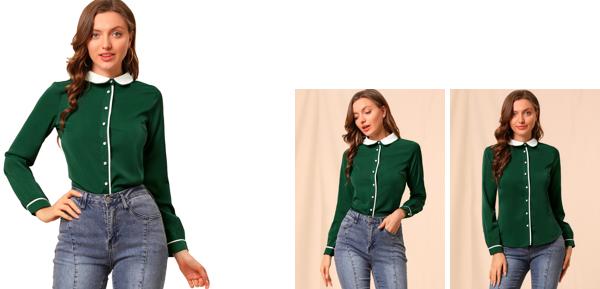 【属性1】ボタンアップシャツ、ピーターパンカラー、長袖、コントラストカラー、前立て、ボタン袖口、パイプ装飾