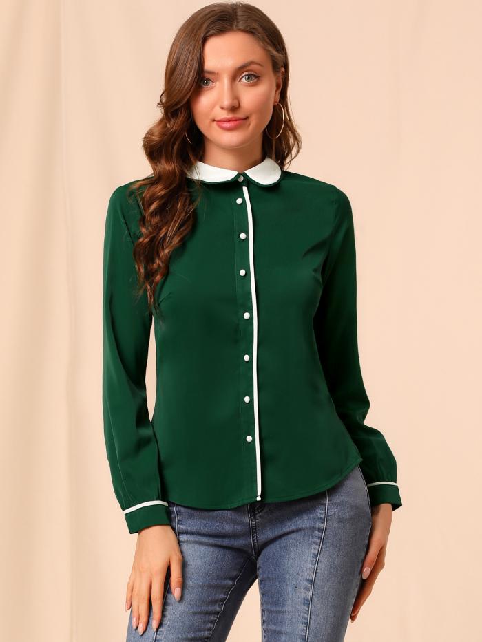 【商品説明】ボタンアップシャツ、ピーターパンカラー、長袖、コントラストカラー、前立て、ボタン袖口、パイプ装飾シーン:オフィス、仕事、ビジネス、カジュアルなど。