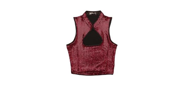 【属性3】このトップは、いくつかのデザイン ポイントで構成されています: ノースリーブ、スタンド ネック、ブラック スパンコール、カットアウト、クロップ タンク トップ