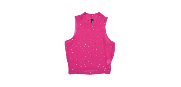 【属性3】メタリックスタープリント、モックネック、ノースリーブ、シースルー、伸縮性、軽量生地(ブラなし)のデザインポイントで構成された薄手のメッシュタンクトップ。