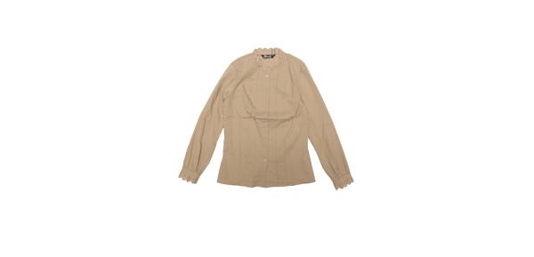 【商品説明】レーストリムのモックネックデザインが、この無地のブラウスシャツに甘くエレガントな雰囲気を加えています。