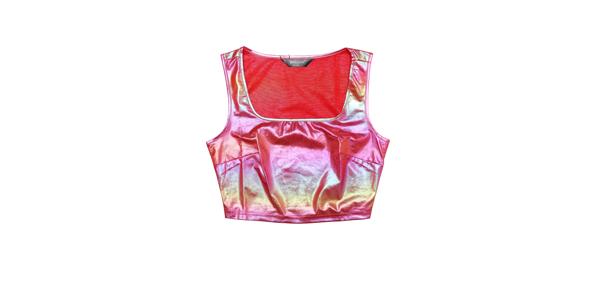 【属性1】メタリックシャイニー、クロップド、Uネック、ノースリーブ。