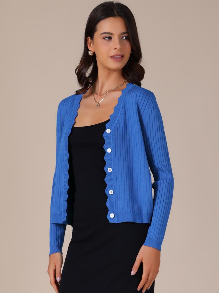 【属性1】長袖Vネックカーディガン、無地ベーシック軽量カーディガン、5つボタン、オープンフロント、リブ編みウェーブエッジ、柔らかく伸縮性のあるニット生地、春秋カジュアルセーターシュラッグ