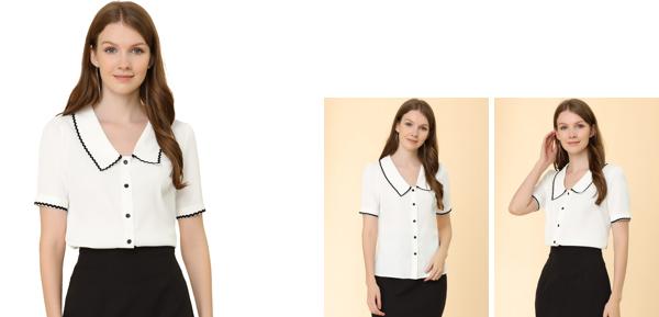 【属性3】このシャツは、シフォン生地、丸襟、パフ半袖、ボタンの袖口、ボタンダウンなど、いくつかのデザインポイントで構成されています。