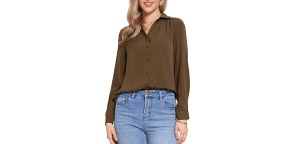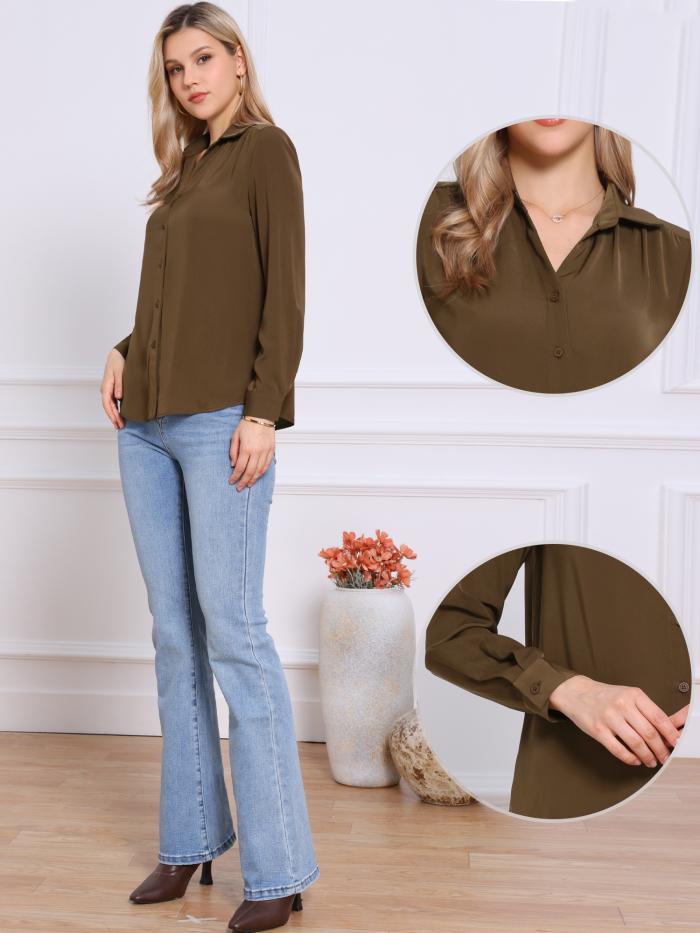 【属性3】このカジュアル シャツは、ラペル カラー、長袖、ボタン ダウン、V ネック、フロントのシャーリング、軽量、無地など、いくつかのデザイン ポイントで構成されています。