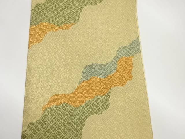 <帯サイズ>(単位:cm) 長さ 436 幅 31 時代 現代(1989 - ) 状態 非常によい 素材 正絹 色目 金・ベージュ 【商品説明】 帯幅部分折れ山線に薄くすみが有ります。 状態は大変良いです。 着用可能です。【茶道具・茶道・着物】本場筑前博多佐賀錦道長取りに吉祥文模様織出し袋帯【中古】【着】 宗sou