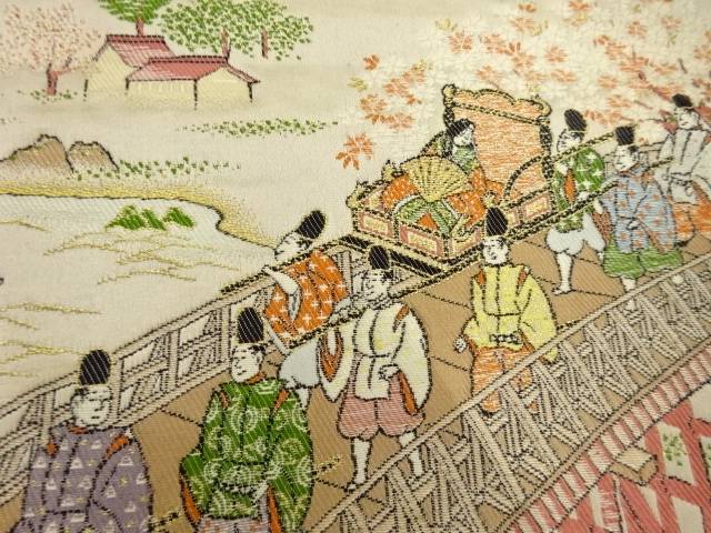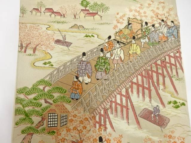<帯サイズ>(単位:cm) 長さ 416 幅 30.5 時代 現代(1989 - ) 状態 よい 素材 正絹 色目 グレーベージュ 【商品説明】 帯幅部分折れ山線にくすみと無地部分、帯裏に点ジミ、薄くすみが有ります。 その他、多少の薄くすみが有ります。 状態は良いです。 着用可能です。【茶道具・茶道・着物】京名所嵐山遊楽之図織り出し袋帯【中古】【着】 宗sou