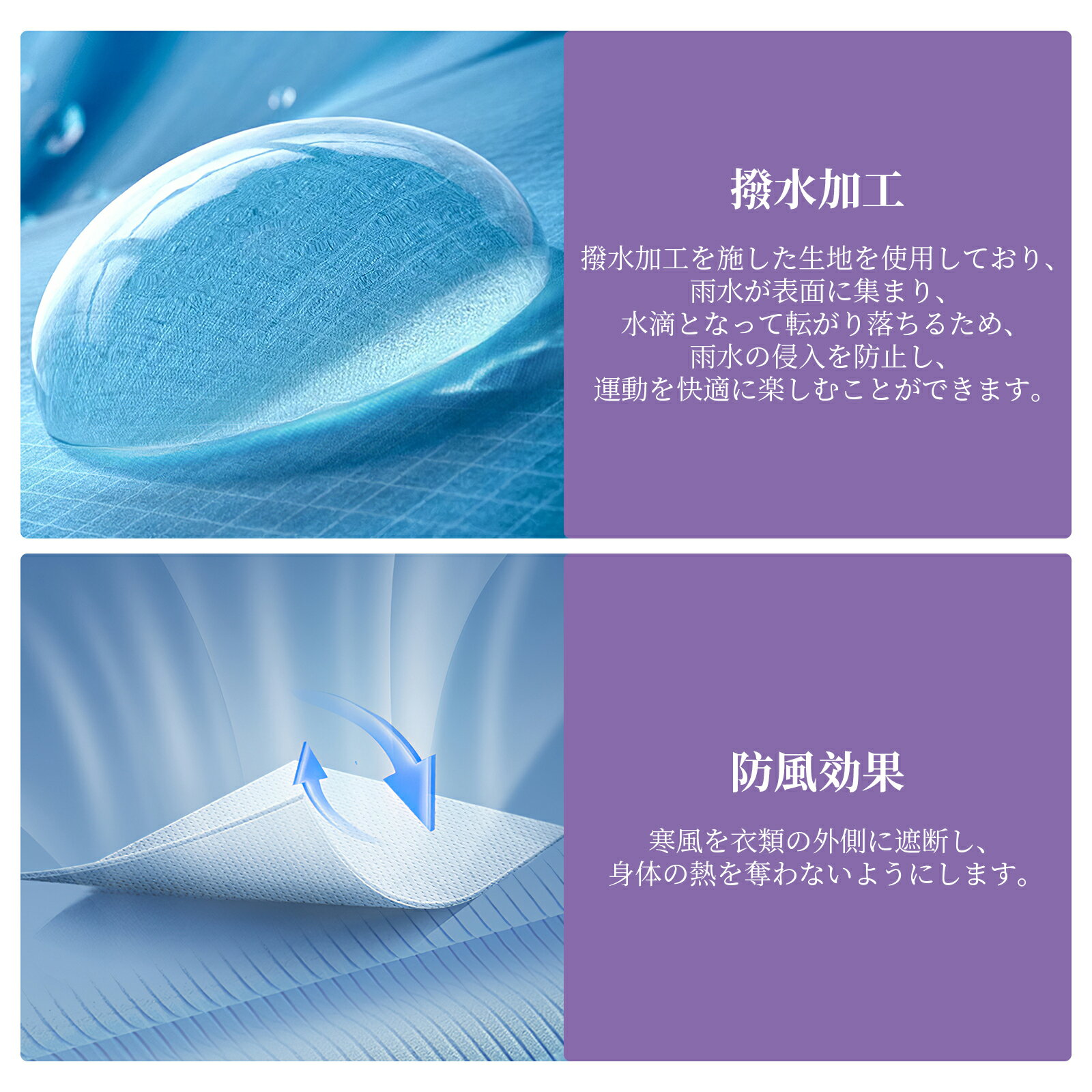 【撥水&防風】撥水加工を施した生地を使用しており、雨水が表面に集まり、水滴となって転がり落ちるため、雨水の侵入を防止し、運動を快適に楽しむことができます。
