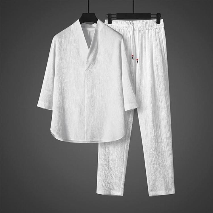 襟付きVネックトップスと調節可能な紐付きパンツの上下セット、シンプルでスタイリッシュなカジュアルウェア。
