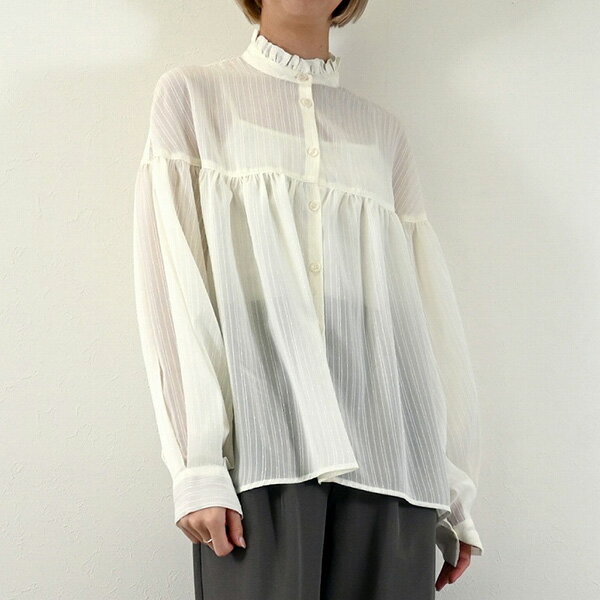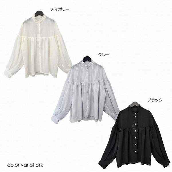 シャツ ブラウス シフォン ギャザー 長袖 フリルカラー スタンドカラー トップス レディース アイボリー グレー ブラック