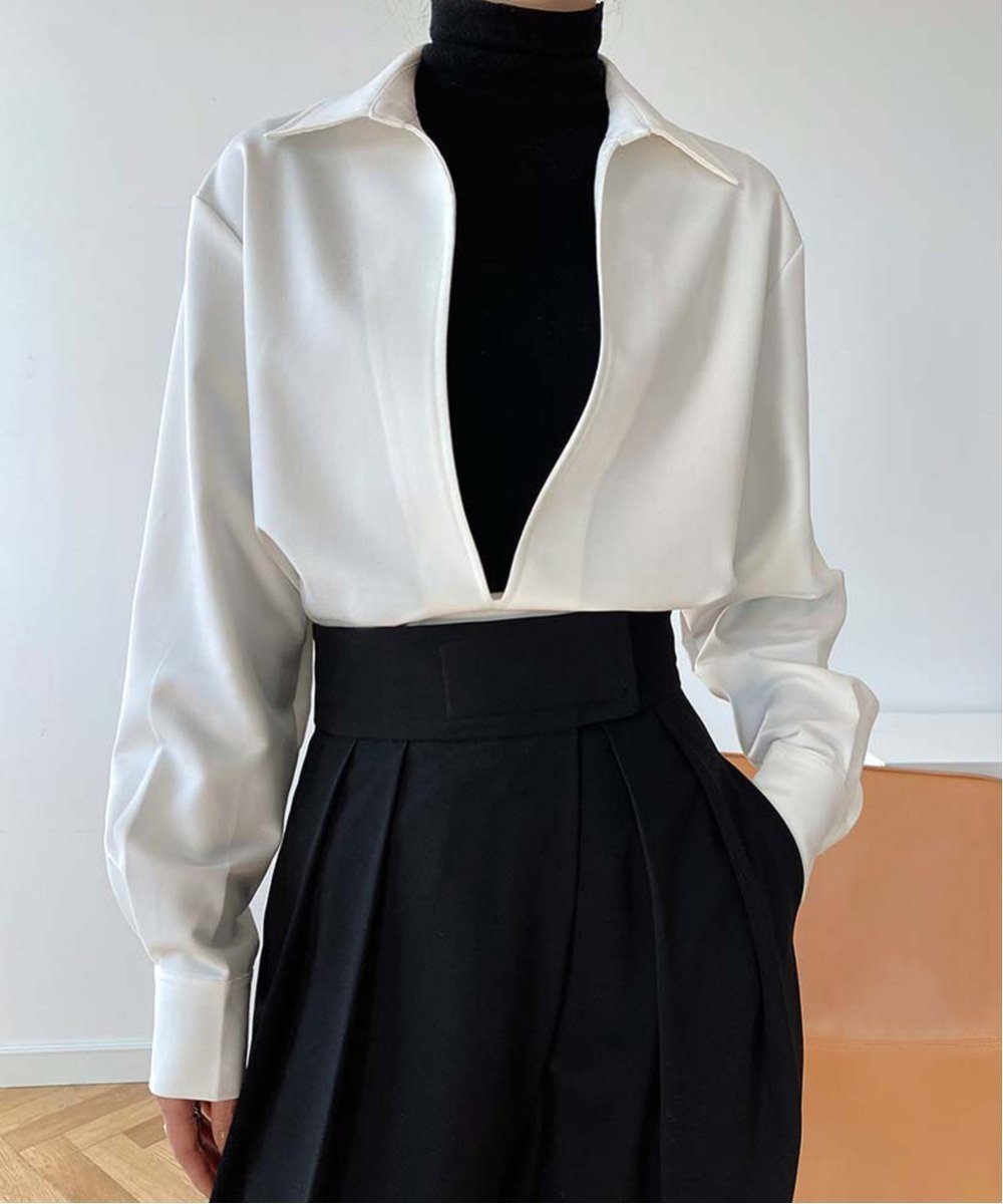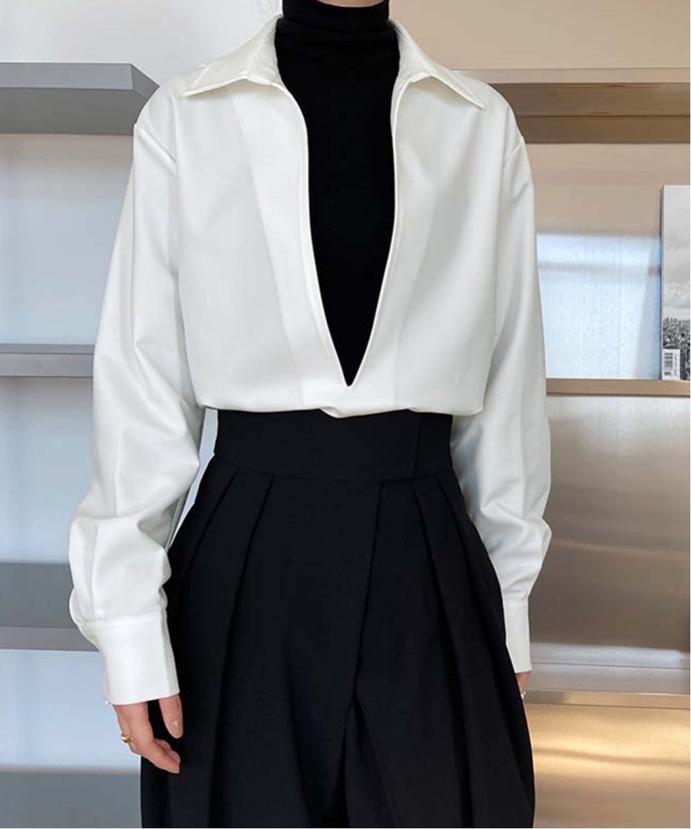 miniministore(ミニミニストア)シャツブラウス 長袖 レディース 韓国おしゃれ スキッパーブラウス 折り襟 無地 プルオーバー 重ね着 オープン フロントネック ワイシャツ 着やせ 30代vネック トップス オフィスカジュアル Yシャツ 通勤OLフロントに大きく開くVネックはとってもお洒落な長袖シャツブラウス大人女性のきちんと感を演出してくれるニットトップスなどとレイヤードして着ることで、コーディネートに立体感が出る素材:ポリエステル90%+レーヨン10%カラー:ホワイト/ブラックサイズ:S/M/L[S]着丈:約68cm 肩幅:約43cm 袖丈:約57cm ゆき:約78.5cm 身幅:約54cm 胸囲:約108cm[M]着丈:約69cm 肩幅:約44cm 袖丈:約58cm ゆき:約80cm 身幅:約55cm 胸囲:約110cm[L]着丈:約70cm 肩幅:約45cm 袖丈:約59cm ゆき:約81.5cm 身幅:約56cm 胸囲:約112cm裏地:なし伸縮性:ややあり透け感:ホワイトのみややあり生産国:中国