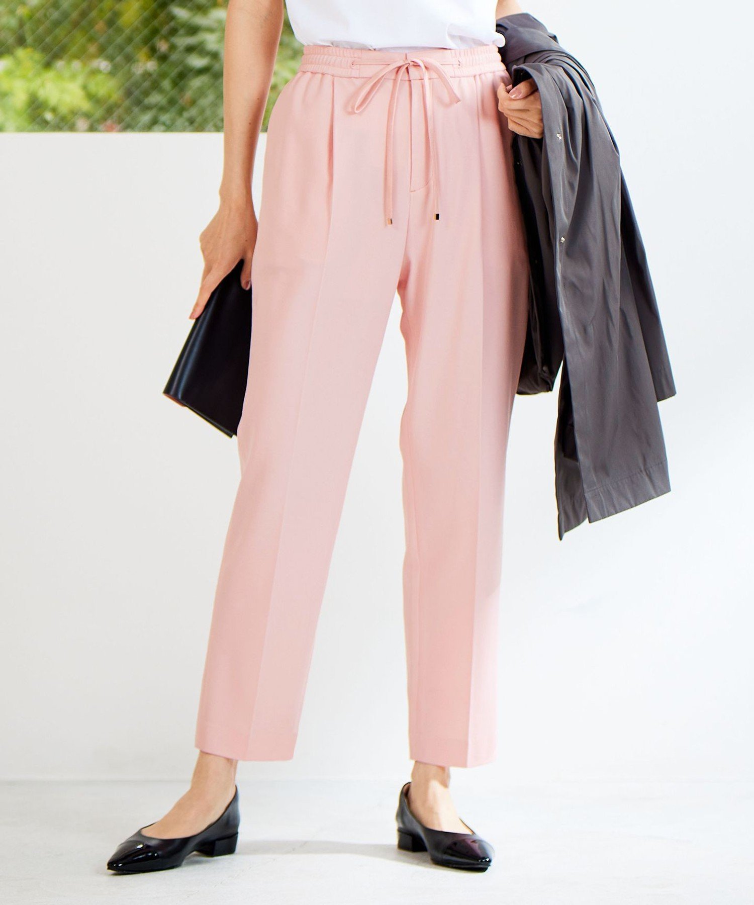 ウエストはゴム入りですが前はファスナー開きなのでイージーパンツでありながらも、もたつかずにすっきりとした見た目です。