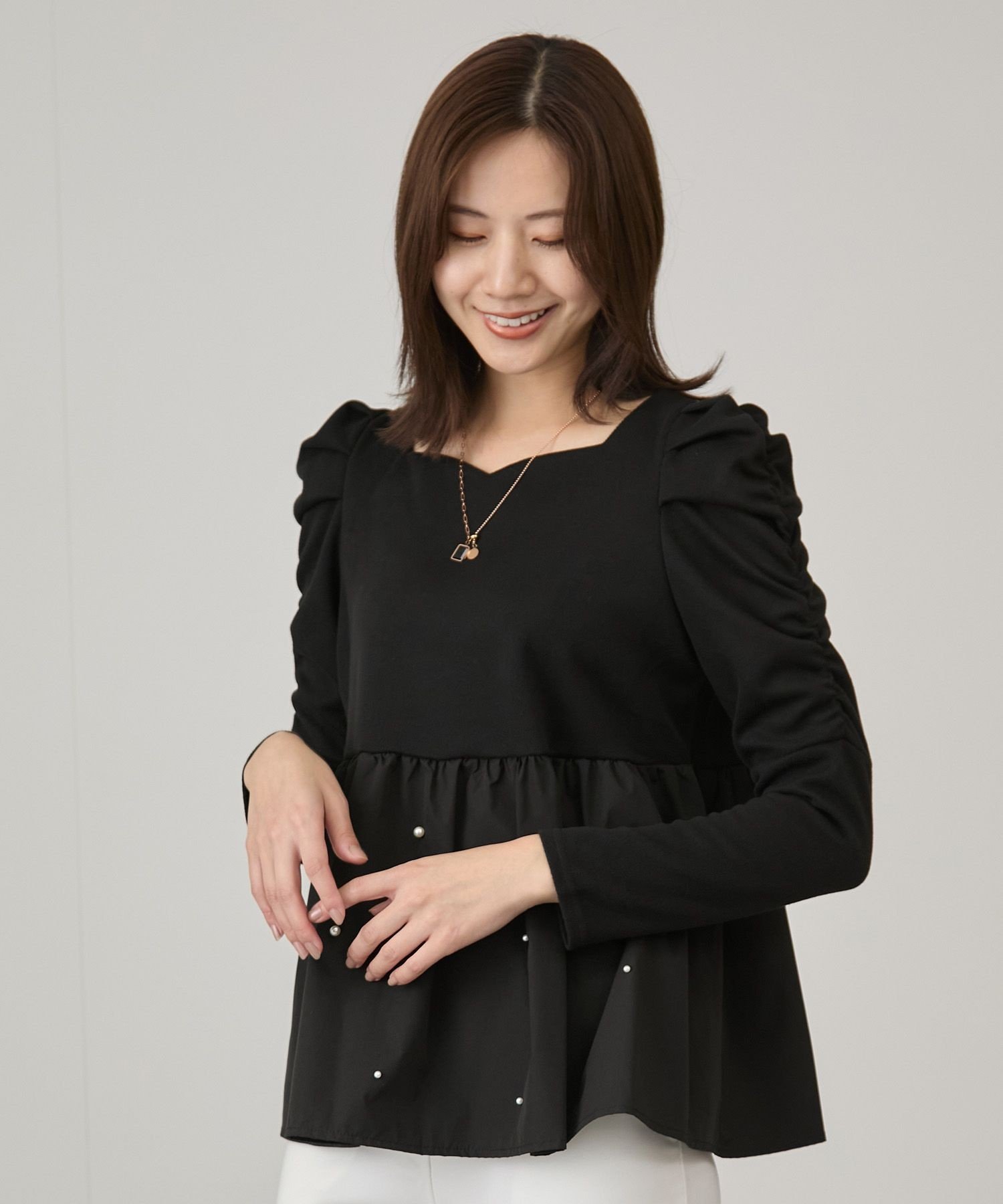 【デザイン・シルエット】パールがランダムにあしらわれた、ペプラムプルオーバーです。