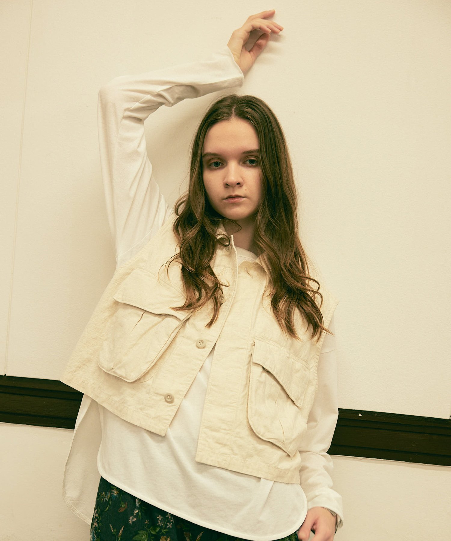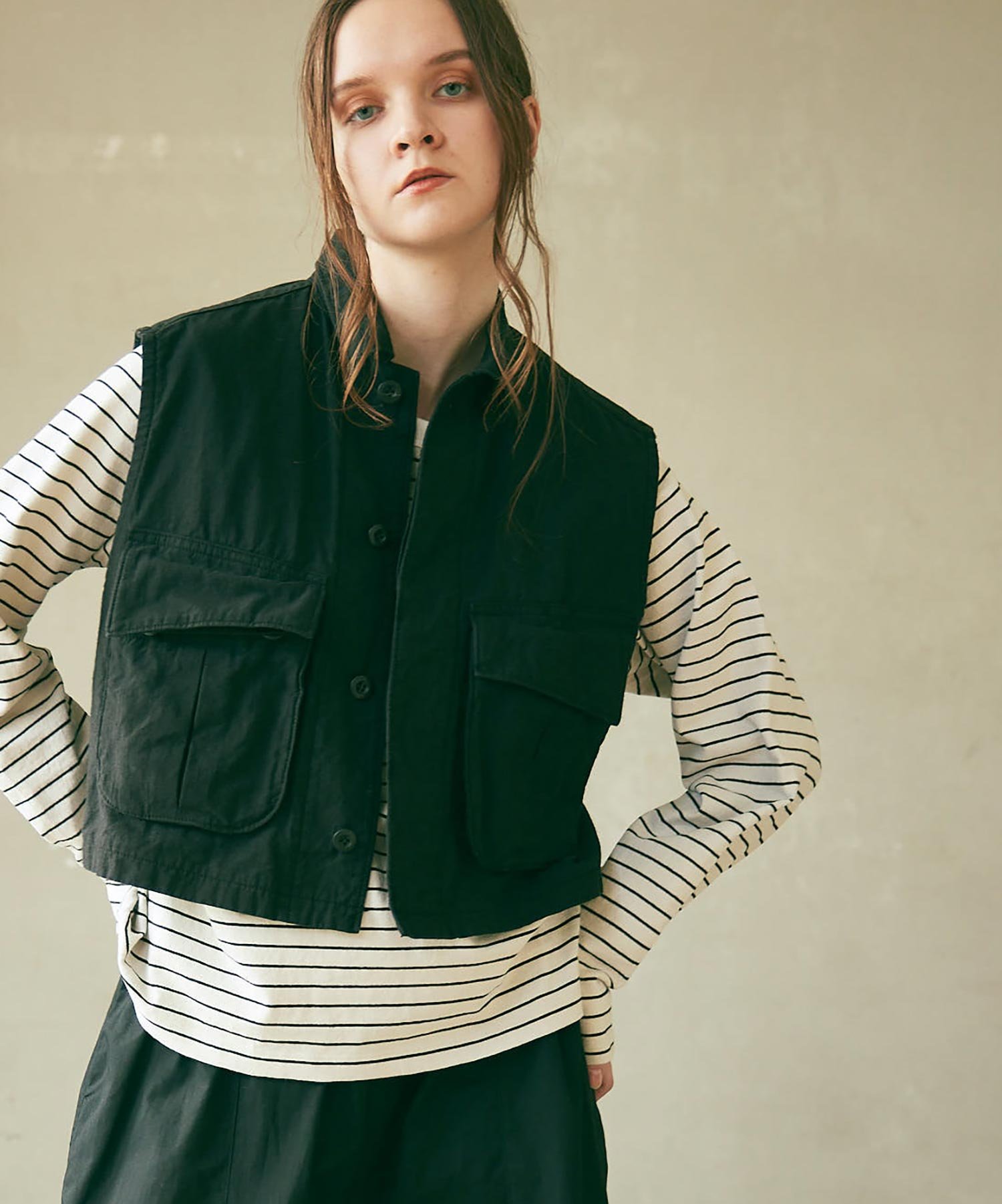 このベストを羽織ることによって、トップスがコンパクトに見えるのがポイント。
