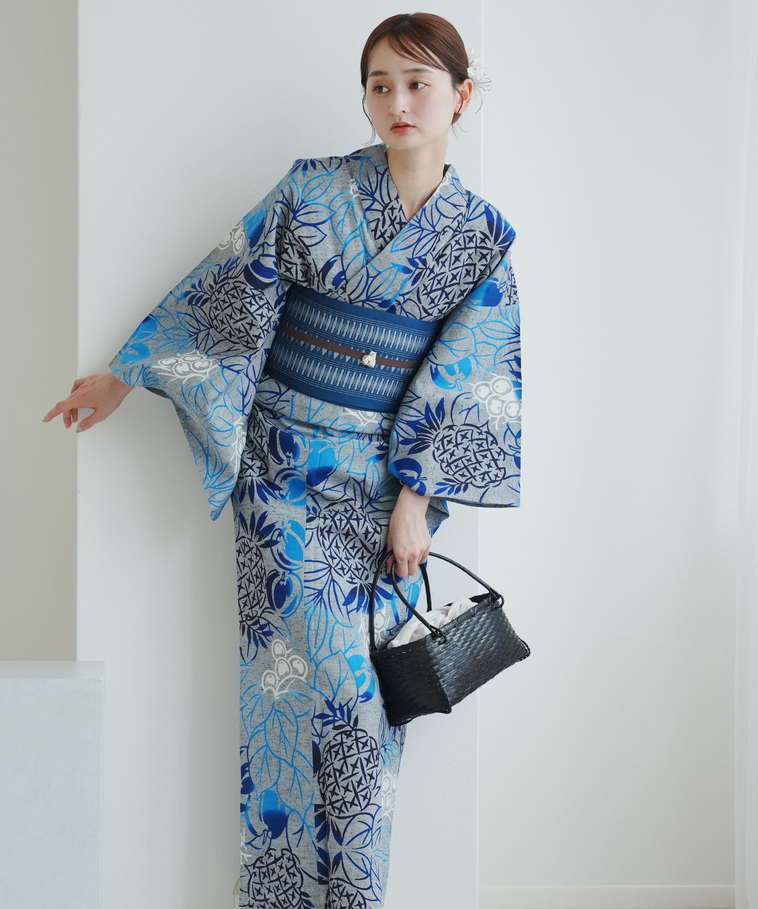 utatane(ウタタネ)utatane*注染工房 日本製 浴衣3点セット 赤坂紬 上品グレーに南国果物職人手染めの特選浴衣シリーズ。