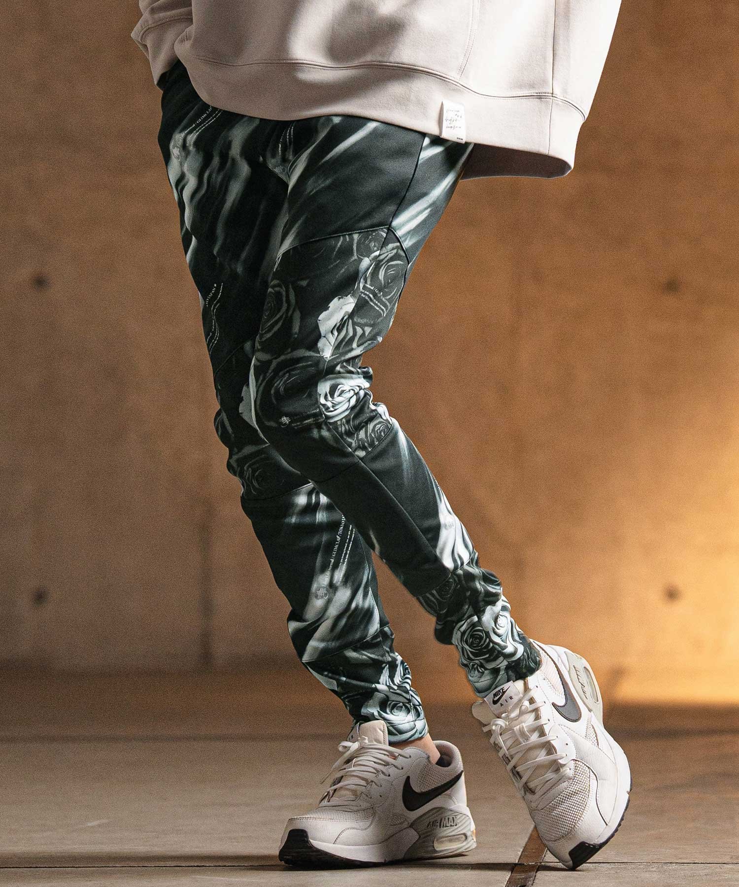 CAMBIO(カンビオ)mp13176- Tight fit track pants-Ver. monochrome pattern switching-175cmB90-W73-H89靴26.5cmのモデルがMサイズを着用。