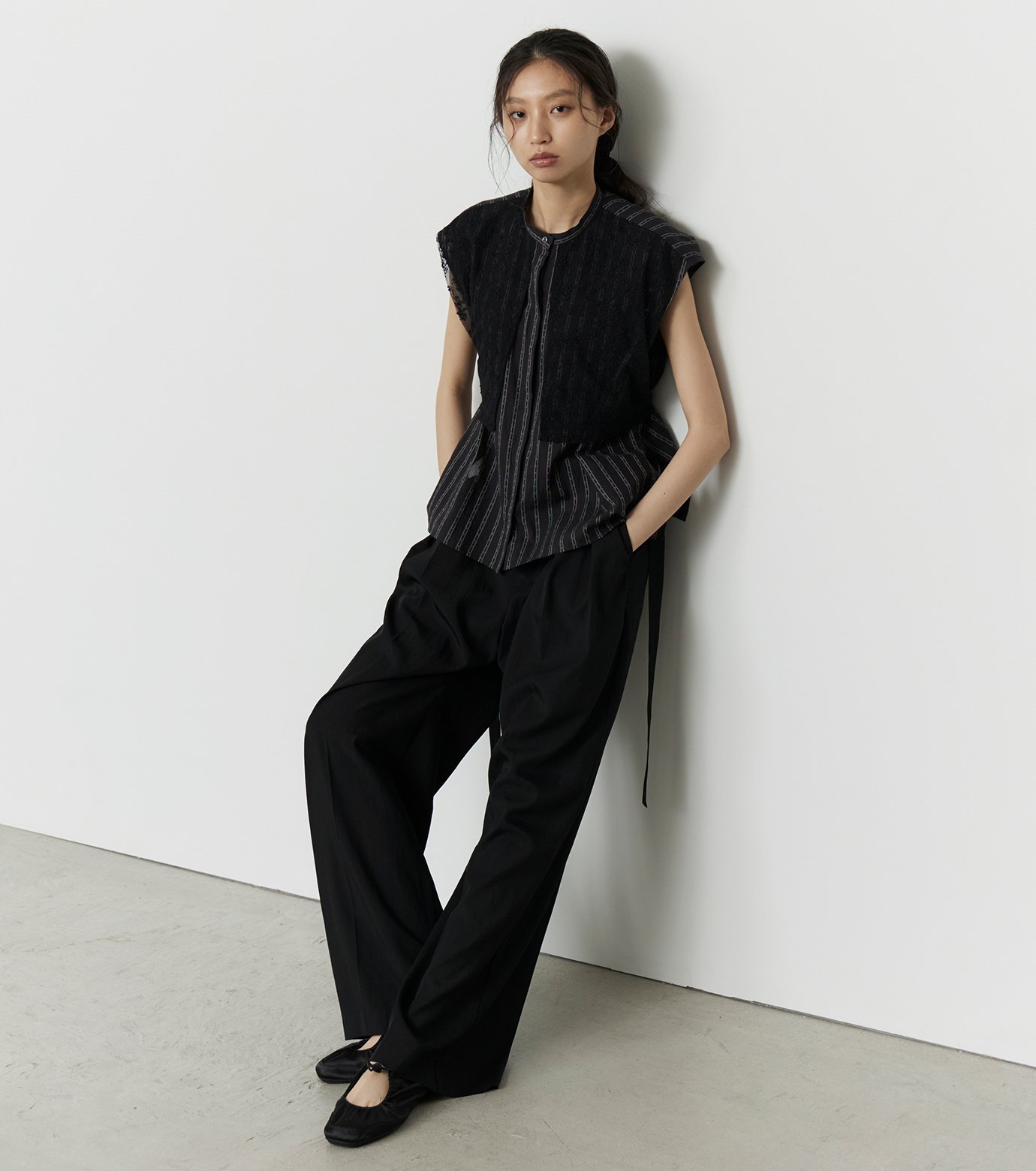 LE CIEL BLEU(ルシェルブルー)ストライプスリーブレスシャツ / Striped Sleeveless Shirt with Lace Bibマニッシュなストライプに、フェミニンなレースビブをあしらったスリーブレスシャツ。