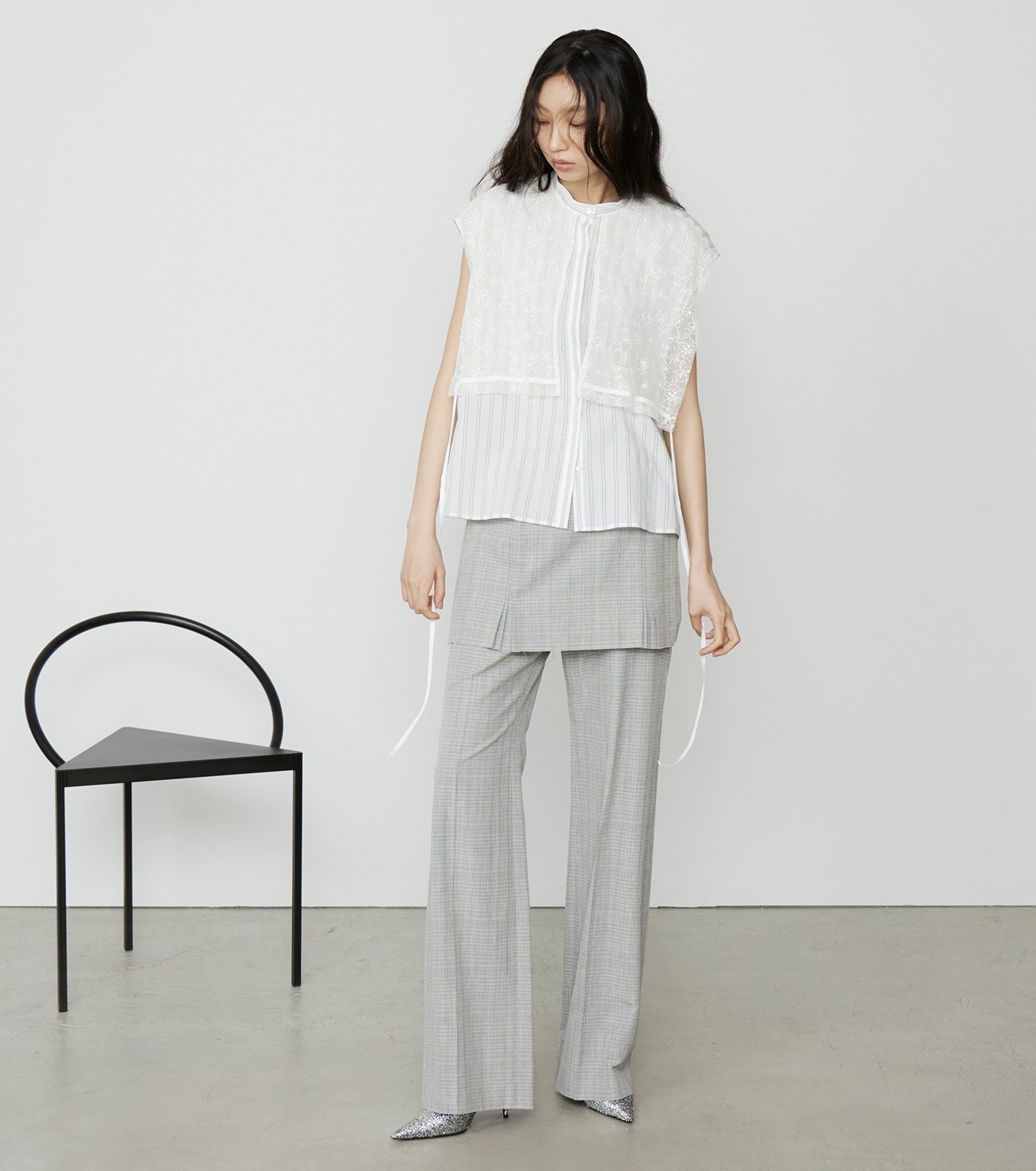 ビブの裾に施されたリボンを結ぶことで、ボクシーなシルエットに表情を加え、自在なスタイリングを楽しめます。
