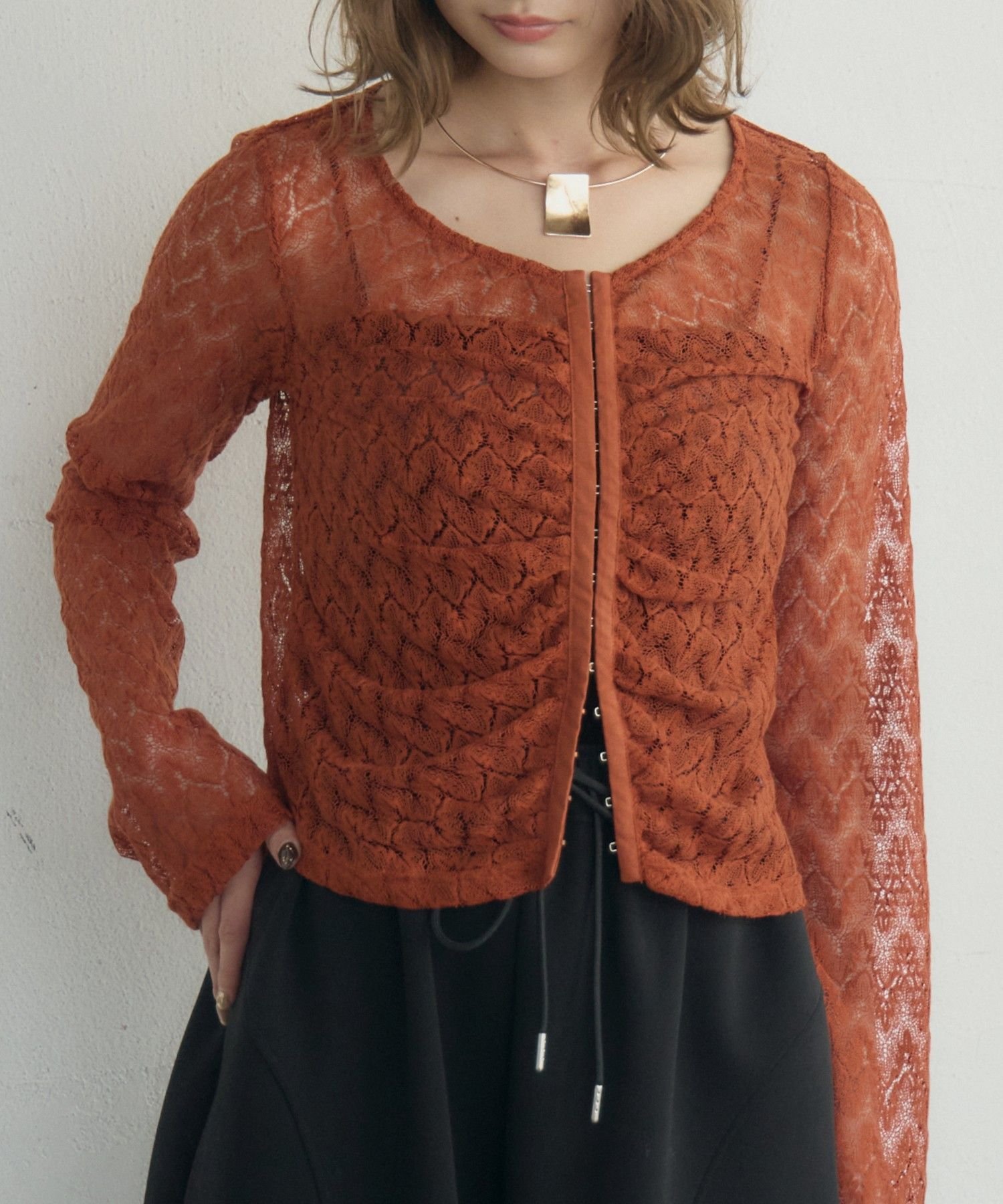 RETRO GIRL(レトロガール)透かしカットカーデ<秋カラーで今から楽しめる◎>▼デザイン・透け感のあるレース素材・フロントはホック仕様・コンパクトめの丈感・ぴたっとしすぎないサイジング▼コーディネート・残暑厳しい晩夏初秋におすすめのアイテム・ホックは下部を数個あけて着用頂くと抜け感が出て◎・ややコンパクトなシルエットなのでボトムはボリュームのあるものやワイド目なデザインが相性よいです------------------------------生地感:薄手伸縮性:なし透け感:あり裏地:なし------------------------------▼ブランド紹介kivi(キヴィ)シンプルだけど、時にエッジを効かせ、「大人のかわいい」の実現へ。